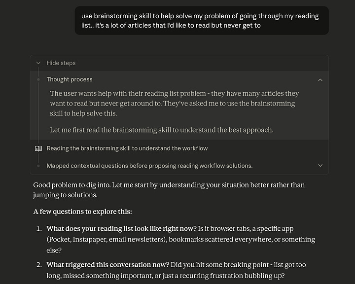 My brainstorming skill is set up to ask clarifying questions rather than generate content–I talk through what I’m thinking, it asks questions, I answer, and through that back-and-forth, my thinking gets clearer.