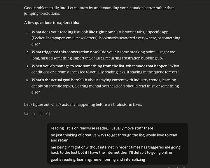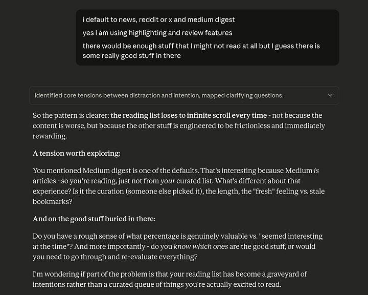 The common thread: AI helps me get to the interesting parts faster. It doesn’t replace my thinking–it sharpens it. It doesn’t generate content for me–it helps me figure out what I actually want to say/read/do. I remain in control.